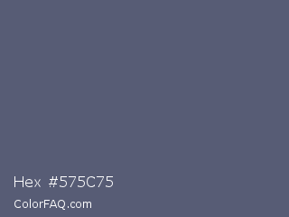 Hex #575c75 Color is a normal blue color and the nearest color is Comet #5c5d75. Hex code #575c75 and RGB value is rgb(87,92,117). In RGB color space, this color is composed of 34% red, 36% green, 46% blue, In CMYK color space, this color is composed of 26% cyan, 21% magenta, 0% yellow , 54% black , In HSL color space, this color has a hue angle of 230° , 15% saturation and 40% lightness.