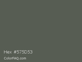 Hex #575d53 Color is a normal green color and the nearest color is Ebony #555d50. Hex code #575d53 and RGB value is rgb(87,93,83). In RGB color space, this color is composed of 34% red, 36% green, 33% blue, In CMYK color space, this color is composed of 6% cyan, 0% magenta, 11% yellow , 64% black , In HSL color space, this color has a hue angle of 96° , 6% saturation and 35% lightness.