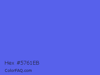 Hex #5761eb Color is a light blue color and the nearest color is Majorelle Blue #6050dc. Hex code #5761eb and RGB value is rgb(87,97,235). In RGB color space, this color is composed of 34% red, 38% green, 92% blue, In CMYK color space, this color is composed of 63% cyan, 59% magenta, 0% yellow , 8% black , In HSL color space, this color has a hue angle of 236° , 79% saturation and 63% lightness.