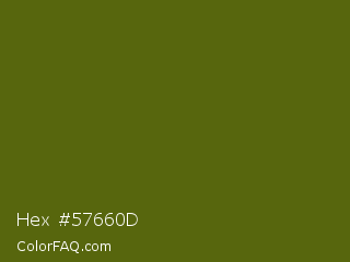 Hex #57660d Color is a dark yellow color and the nearest color is Saratoga #555b10. Hex code #57660d and RGB value is rgb(87,102,13). In RGB color space, this color is composed of 34% red, 40% green, 5% blue, In CMYK color space, this color is composed of 15% cyan, 0% magenta, 87% yellow , 60% black , In HSL color space, this color has a hue angle of 70° , 77% saturation and 23% lightness.