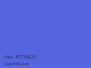 Hex #5766dc Color is a normal blue color and the nearest color is Royal Blue #4169e1. Hex code #5766dc and RGB value is rgb(87,102,220). In RGB color space, this color is composed of 34% red, 40% green, 86% blue, In CMYK color space, this color is composed of 60% cyan, 54% magenta, 0% yellow , 14% black , In HSL color space, this color has a hue angle of 233° , 66% saturation and 60% lightness.