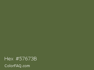Hex #57673b Color is a normal green color and the nearest color is Chalet Green #516e3d. Hex code #57673b and RGB value is rgb(87,103,59). In RGB color space, this color is composed of 34% red, 40% green, 23% blue, In CMYK color space, this color is composed of 16% cyan, 0% magenta, 43% yellow , 60% black , In HSL color space, this color has a hue angle of 82° , 27% saturation and 32% lightness.