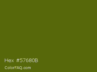 Hex #57680b Color is a dark lime color and the nearest color is Saratoga #555b10. Hex code #57680b and RGB value is rgb(87,104,11). In RGB color space, this color is composed of 34% red, 41% green, 4% blue, In CMYK color space, this color is composed of 16% cyan, 0% magenta, 89% yellow , 59% black , In HSL color space, this color has a hue angle of 71° , 81% saturation and 23% lightness.