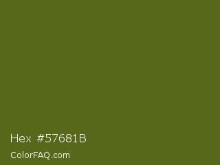 Hex #57681b Color is a dark lime color and the nearest color is Saratoga #555b10. Hex code #57681b and RGB value is rgb(87,104,27). In RGB color space, this color is composed of 34% red, 41% green, 11% blue, In CMYK color space, this color is composed of 16% cyan, 0% magenta, 74% yellow , 59% black , In HSL color space, this color has a hue angle of 73° , 59% saturation and 26% lightness.