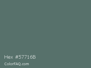 Hex #57716b Color is a normal cyan color and the nearest color is Corduroy #606e68. Hex code #57716b and RGB value is rgb(87,113,107). In RGB color space, this color is composed of 34% red, 44% green, 42% blue, In CMYK color space, this color is composed of 23% cyan, 0% magenta, 5% yellow , 56% black , In HSL color space, this color has a hue angle of 166° , 13% saturation and 39% lightness.