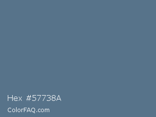 Hex #57738a Color is a normal blue color and the nearest color is Kashmir Blue #507096. Hex code #57738a and RGB value is rgb(87,115,138). In RGB color space, this color is composed of 34% red, 45% green, 54% blue, In CMYK color space, this color is composed of 37% cyan, 17% magenta, 0% yellow , 46% black , In HSL color space, this color has a hue angle of 207° , 23% saturation and 44% lightness.