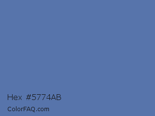 Hex #5774ab Color is a normal blue color and the nearest color is Blue Yonder #5072a7. Hex code #5774ab and RGB value is rgb(87,116,171). In RGB color space, this color is composed of 34% red, 45% green, 67% blue, In CMYK color space, this color is composed of 49% cyan, 32% magenta, 0% yellow , 33% black , In HSL color space, this color has a hue angle of 219° , 33% saturation and 51% lightness.