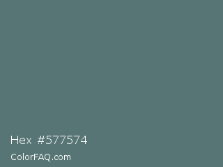 Hex #577574 Color is a normal cyan color and the nearest color is Cutty Sark #507672. Hex code #577574 and RGB value is rgb(87,117,116). In RGB color space, this color is composed of 34% red, 46% green, 45% blue, In CMYK color space, this color is composed of 26% cyan, 0% magenta, 1% yellow , 54% black , In HSL color space, this color has a hue angle of 178° , 15% saturation and 40% lightness.