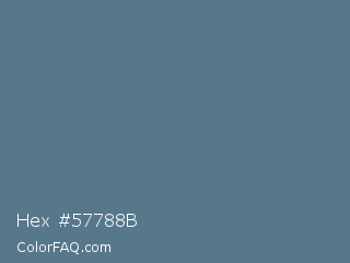 Hex #57788b Color is a normal blue color and the nearest color is Smalt Blue #51808f. Hex code #57788b and RGB value is rgb(87,120,139). In RGB color space, this color is composed of 34% red, 47% green, 55% blue, In CMYK color space, this color is composed of 37% cyan, 14% magenta, 0% yellow , 45% black , In HSL color space, this color has a hue angle of 202° , 23% saturation and 44% lightness.