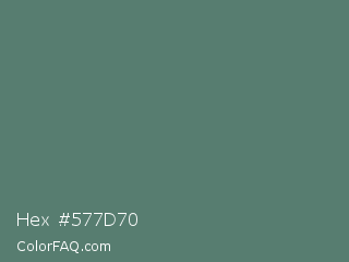 Hex #577d70 Color is a normal green color and the nearest color is Cutty Sark #507672. Hex code #577d70 and RGB value is rgb(87,125,112). In RGB color space, this color is composed of 34% red, 49% green, 44% blue, In CMYK color space, this color is composed of 30% cyan, 0% magenta, 10% yellow , 51% black , In HSL color space, this color has a hue angle of 159° , 18% saturation and 42% lightness.