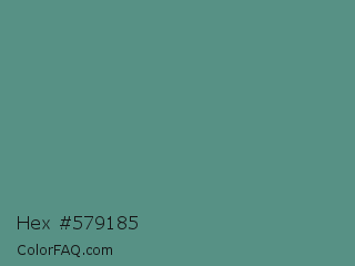 Hex #579185 Color is a normal cyan color and the nearest color is Wintergreen Dream #56887d. Hex code #579185 and RGB value is rgb(87,145,133). In RGB color space, this color is composed of 34% red, 57% green, 52% blue, In CMYK color space, this color is composed of 40% cyan, 0% magenta, 8% yellow , 43% black , In HSL color space, this color has a hue angle of 168° , 25% saturation and 45% lightness.