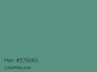 Hex #579282 Color is a normal cyan color and the nearest color is Wintergreen Dream #56887d. Hex code #579282 and RGB value is rgb(87,146,130). In RGB color space, this color is composed of 34% red, 57% green, 51% blue, In CMYK color space, this color is composed of 40% cyan, 0% magenta, 11% yellow , 43% black , In HSL color space, this color has a hue angle of 164° , 25% saturation and 46% lightness.