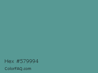 Hex #579994 Color is a normal cyan color and the nearest color is Polished Pine #5da493. Hex code #579994 and RGB value is rgb(87,153,148). In RGB color space, this color is composed of 34% red, 60% green, 58% blue, In CMYK color space, this color is composed of 43% cyan, 0% magenta, 3% yellow , 40% black , In HSL color space, this color has a hue angle of 175° , 28% saturation and 47% lightness.