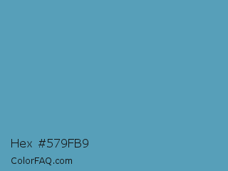 Hex #579fb9 Color is a normal blue color and the nearest color is Hippie Blue #589aaf. Hex code #579fb9 and RGB value is rgb(87,159,185). In RGB color space, this color is composed of 34% red, 62% green, 73% blue, In CMYK color space, this color is composed of 53% cyan, 14% magenta, 0% yellow , 27% black , In HSL color space, this color has a hue angle of 196° , 41% saturation and 53% lightness.