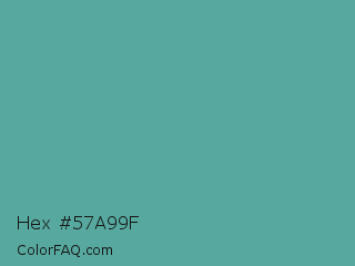 Hex #57a99f Color is a normal cyan color and the nearest color is Breaker Bay #5da19f. Hex code #57a99f and RGB value is rgb(87,169,159). In RGB color space, this color is composed of 34% red, 66% green, 62% blue, In CMYK color space, this color is composed of 49% cyan, 0% magenta, 6% yellow , 34% black , In HSL color space, this color has a hue angle of 173° , 32% saturation and 50% lightness.