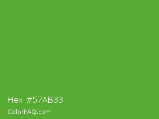 Hex #57ab33 Color is a normal green color and the nearest color is Apple #4fa83d. Hex code #57ab33 and RGB value is rgb(87,171,51). In RGB color space, this color is composed of 34% red, 67% green, 20% blue, In CMYK color space, this color is composed of 49% cyan, 0% magenta, 70% yellow , 33% black , In HSL color space, this color has a hue angle of 102° , 54% saturation and 44% lightness.
