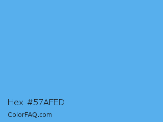 Hex #57afed Color is a light blue color and the nearest color is Blue Jeans #5dadec. Hex code #57afed and RGB value is rgb(87,175,237). In RGB color space, this color is composed of 34% red, 69% green, 93% blue, In CMYK color space, this color is composed of 63% cyan, 26% magenta, 0% yellow , 7% black , In HSL color space, this color has a hue angle of 205° , 81% saturation and 64% lightness.