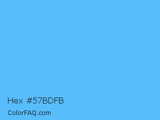 Hex #57bdfb Color is a light blue color and the nearest color is Blue Jeans #5dadec. Hex code #57bdfb and RGB value is rgb(87,189,251). In RGB color space, this color is composed of 34% red, 74% green, 98% blue, In CMYK color space, this color is composed of 65% cyan, 25% magenta, 0% yellow , 2% black , In HSL color space, this color has a hue angle of 203° , 95% saturation and 66% lightness.