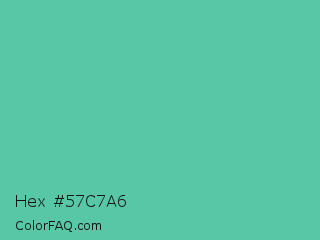 Hex #57c7a6 Color is a normal green color and the nearest color is Tradewind #5fb3ac. Hex code #57c7a6 and RGB value is rgb(87,199,166). In RGB color space, this color is composed of 34% red, 78% green, 65% blue, In CMYK color space, this color is composed of 56% cyan, 0% magenta, 17% yellow , 22% black , In HSL color space, this color has a hue angle of 162° , 50% saturation and 56% lightness.