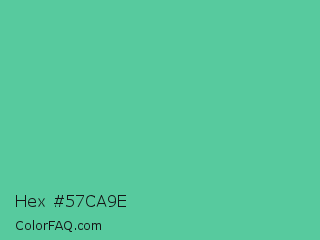 Hex #57ca9e Color is a normal green color and the nearest color is Ocean Green #48bf91. Hex code #57ca9e and RGB value is rgb(87,202,158). In RGB color space, this color is composed of 34% red, 79% green, 62% blue, In CMYK color space, this color is composed of 57% cyan, 0% magenta, 22% yellow , 21% black , In HSL color space, this color has a hue angle of 157° , 52% saturation and 57% lightness.