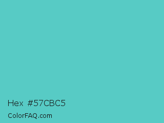 Hex #57cbc5 Color is a normal cyan color and the nearest color is Sea Serpent #4bc7cf. Hex code #57cbc5 and RGB value is rgb(87,203,197). In RGB color space, this color is composed of 34% red, 80% green, 77% blue, In CMYK color space, this color is composed of 57% cyan, 0% magenta, 3% yellow , 20% black , In HSL color space, this color has a hue angle of 177° , 53% saturation and 57% lightness.