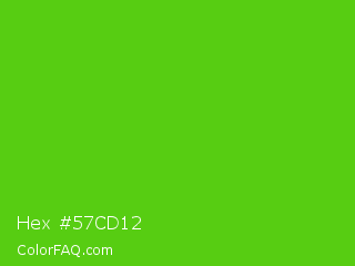 Hex #57cd12 Color is a normal green color and the nearest color is Harlequin Green #46cb18. Hex code #57cd12 and RGB value is rgb(87,205,18). In RGB color space, this color is composed of 34% red, 80% green, 7% blue, In CMYK color space, this color is composed of 58% cyan, 0% magenta, 91% yellow , 20% black , In HSL color space, this color has a hue angle of 98° , 84% saturation and 44% lightness.