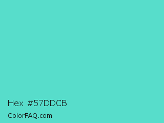 Hex #57ddcb Color is a normal cyan color and the nearest color is Medium Turquoise #48d1cc. Hex code #57ddcb and RGB value is rgb(87,221,203). In RGB color space, this color is composed of 34% red, 87% green, 80% blue, In CMYK color space, this color is composed of 61% cyan, 0% magenta, 8% yellow , 13% black , In HSL color space, this color has a hue angle of 172° , 66% saturation and 60% lightness.