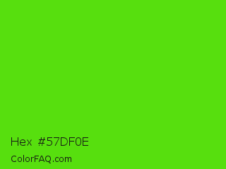 Hex #57df0e Color is a normal green color and the nearest color is Harlequin Green #46cb18. Hex code #57df0e and RGB value is rgb(87,223,14). In RGB color space, this color is composed of 34% red, 87% green, 5% blue, In CMYK color space, this color is composed of 61% cyan, 0% magenta, 94% yellow , 13% black , In HSL color space, this color has a hue angle of 99° , 88% saturation and 46% lightness.
