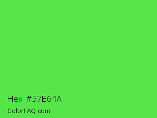Hex #57e64a Color is a normal green color and the nearest color is Screamin Green #66ff66. Hex code #57e64a and RGB value is rgb(87,230,74). In RGB color space, this color is composed of 34% red, 90% green, 29% blue, In CMYK color space, this color is composed of 62% cyan, 0% magenta, 68% yellow , 10% black , In HSL color space, this color has a hue angle of 115° , 76% saturation and 60% lightness.