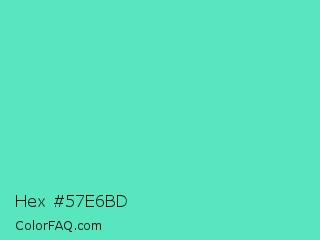 Hex #57e6bd Color is a light green color and the nearest color is Medium Aquamarine #66ddaa. Hex code #57e6bd and RGB value is rgb(87,230,189). In RGB color space, this color is composed of 34% red, 90% green, 74% blue, In CMYK color space, this color is composed of 62% cyan, 0% magenta, 18% yellow , 10% black , In HSL color space, this color has a hue angle of 163° , 74% saturation and 62% lightness.