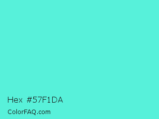 Hex #57f1da Color is a light cyan color and the nearest color is Turquoise #40e0d0. Hex code #57f1da and RGB value is rgb(87,241,218). In RGB color space, this color is composed of 34% red, 95% green, 85% blue, In CMYK color space, this color is composed of 64% cyan, 0% magenta, 10% yellow , 5% black , In HSL color space, this color has a hue angle of 171° , 85% saturation and 64% lightness.