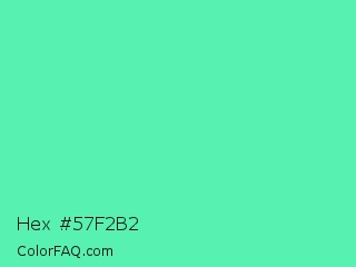 Hex #57f2b2 Color is a light green color and the nearest color is Medium Aquamarine #66ddaa. Hex code #57f2b2 and RGB value is rgb(87,242,178). In RGB color space, this color is composed of 34% red, 95% green, 70% blue, In CMYK color space, this color is composed of 64% cyan, 0% magenta, 26% yellow , 5% black , In HSL color space, this color has a hue angle of 155° , 86% saturation and 65% lightness.