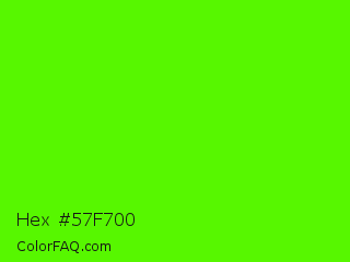 Hex #57f700 Color is a normal green color and the nearest color is Chlorophyll Green #4aff00. Hex code #57f700 and RGB value is rgb(87,247,0). In RGB color space, this color is composed of 34% red, 97% green, 0% blue, In CMYK color space, this color is composed of 65% cyan, 0% magenta, 100% yellow , 3% black , In HSL color space, this color has a hue angle of 99° , 100% saturation and 48% lightness.