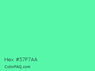 Hex #57f7aa Color is a light green color and the nearest color is Medium Aquamarine #66ddaa. Hex code #57f7aa and RGB value is rgb(87,247,170). In RGB color space, this color is composed of 34% red, 97% green, 67% blue, In CMYK color space, this color is composed of 65% cyan, 0% magenta, 31% yellow , 3% black , In HSL color space, this color has a hue angle of 151° , 91% saturation and 65% lightness.