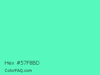 Hex #57f8bd Color is a light green color and the nearest color is Medium Aquamarine #66ddaa. Hex code #57f8bd and RGB value is rgb(87,248,189). In RGB color space, this color is composed of 34% red, 97% green, 74% blue, In CMYK color space, this color is composed of 65% cyan, 0% magenta, 24% yellow , 3% black , In HSL color space, this color has a hue angle of 158° , 92% saturation and 66% lightness.
