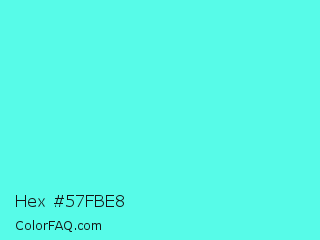 Hex #57fbe8 Color is a light cyan color and the nearest color is Turquoise Blue #6cdae7. Hex code #57fbe8 and RGB value is rgb(87,251,232). In RGB color space, this color is composed of 34% red, 98% green, 91% blue, In CMYK color space, this color is composed of 65% cyan, 0% magenta, 8% yellow , 2% black , In HSL color space, this color has a hue angle of 173° , 95% saturation and 66% lightness.