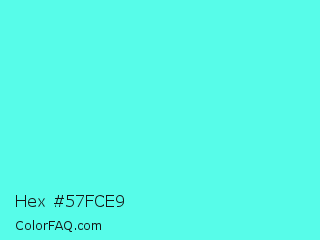 Hex #57fce9 Color is a light cyan color and the nearest color is Turquoise Blue #6cdae7. Hex code #57fce9 and RGB value is rgb(87,252,233). In RGB color space, this color is composed of 34% red, 99% green, 91% blue, In CMYK color space, this color is composed of 65% cyan, 0% magenta, 8% yellow , 1% black , In HSL color space, this color has a hue angle of 173° , 96% saturation and 66% lightness.