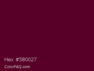 Hex #580027 Color is a very dark rose color and the nearest color is Bordeaux #5c0120. Hex code #580027 and RGB value is rgb(88,0,39). In RGB color space, this color is composed of 35% red, 0% green, 15% blue, In CMYK color space, this color is composed of 0% cyan, 100% magenta, 56% yellow , 65% black , In HSL color space, this color has a hue angle of 333° , 100% saturation and 17% lightness.