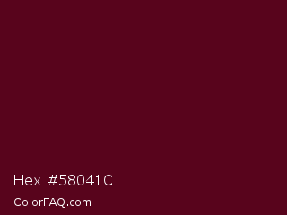 Hex #58041c Color is a very dark rose color and the nearest color is Dark Scarlet #560319. Hex code #58041c and RGB value is rgb(88,4,28). In RGB color space, this color is composed of 35% red, 2% green, 11% blue, In CMYK color space, this color is composed of 0% cyan, 95% magenta, 68% yellow , 65% black , In HSL color space, this color has a hue angle of 343° , 91% saturation and 18% lightness.