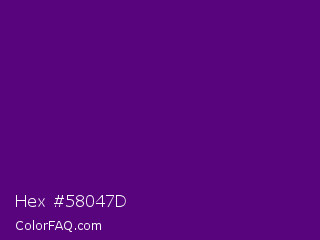 Hex #58047d Color is a dark purple color and the nearest color is Pigment Indigo #4b0082. Hex code #58047d and RGB value is rgb(88,4,125). In RGB color space, this color is composed of 35% red, 2% green, 49% blue, In CMYK color space, this color is composed of 30% cyan, 97% magenta, 0% yellow , 51% black , In HSL color space, this color has a hue angle of 282° , 94% saturation and 25% lightness.