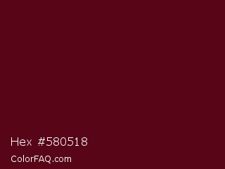 Hex #580518 Color is a very dark red color and the nearest color is Dark Scarlet #560319. Hex code #580518 and RGB value is rgb(88,5,24). In RGB color space, this color is composed of 35% red, 2% green, 9% blue, In CMYK color space, this color is composed of 0% cyan, 94% magenta, 73% yellow , 65% black , In HSL color space, this color has a hue angle of 346° , 89% saturation and 18% lightness.
