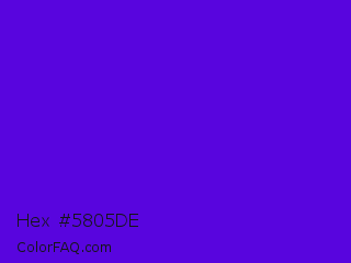 Hex #5805de Color is a normal violet color and the nearest color is Han Purple #5218fa. Hex code #5805de and RGB value is rgb(88,5,222). In RGB color space, this color is composed of 35% red, 2% green, 87% blue, In CMYK color space, this color is composed of 60% cyan, 98% magenta, 0% yellow , 13% black , In HSL color space, this color has a hue angle of 263° , 96% saturation and 45% lightness.