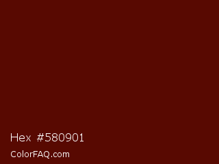 Hex #580901 Color is a very dark red color and the nearest color is Mahogany #4e0606. Hex code #580901 and RGB value is rgb(88,9,1). In RGB color space, this color is composed of 35% red, 4% green, 0% blue, In CMYK color space, this color is composed of 0% cyan, 90% magenta, 99% yellow , 65% black , In HSL color space, this color has a hue angle of 6° , 98% saturation and 17% lightness.