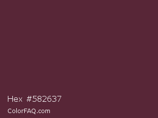 Hex #582637 Color is a dark rose color and the nearest color is Wine Berry #591d35. Hex code #582637 and RGB value is rgb(88,38,55). In RGB color space, this color is composed of 35% red, 15% green, 22% blue, In CMYK color space, this color is composed of 0% cyan, 57% magenta, 38% yellow , 65% black , In HSL color space, this color has a hue angle of 340° , 40% saturation and 25% lightness.