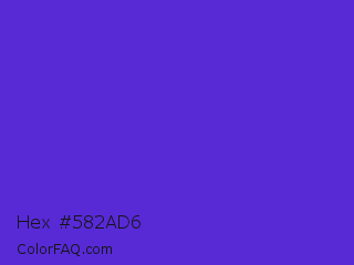 Hex #582ad6 Color is a normal indigo color and the nearest color is Purple Heart Crayola #652dc1. Hex code #582ad6 and RGB value is rgb(88,42,214). In RGB color space, this color is composed of 35% red, 16% green, 84% blue, In CMYK color space, this color is composed of 59% cyan, 80% magenta, 0% yellow , 16% black , In HSL color space, this color has a hue angle of 256° , 68% saturation and 50% lightness.