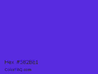 Hex #582be1 Color is a normal indigo color and the nearest color is Han Purple #5218fa. Hex code #582be1 and RGB value is rgb(88,43,225). In RGB color space, this color is composed of 35% red, 17% green, 88% blue, In CMYK color space, this color is composed of 61% cyan, 81% magenta, 0% yellow , 12% black , In HSL color space, this color has a hue angle of 255° , 75% saturation and 53% lightness.