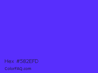 Hex #582efd Color is a normal indigo color and the nearest color is Han Purple #5218fa. Hex code #582efd and RGB value is rgb(88,46,253). In RGB color space, this color is composed of 35% red, 18% green, 99% blue, In CMYK color space, this color is composed of 65% cyan, 82% magenta, 0% yellow , 1% black , In HSL color space, this color has a hue angle of 252° , 98% saturation and 59% lightness.