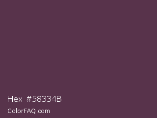 Hex #58334b Color is a dark magenta color and the nearest color is Voodoo #533455. Hex code #58334b and RGB value is rgb(88,51,75). In RGB color space, this color is composed of 35% red, 20% green, 29% blue, In CMYK color space, this color is composed of 0% cyan, 42% magenta, 15% yellow , 65% black , In HSL color space, this color has a hue angle of 321° , 27% saturation and 27% lightness.