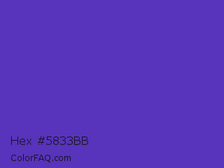Hex #5833bb Color is a normal indigo color and the nearest color is Purple Heart Crayola #652dc1. Hex code #5833bb and RGB value is rgb(88,51,187). In RGB color space, this color is composed of 35% red, 20% green, 73% blue, In CMYK color space, this color is composed of 53% cyan, 73% magenta, 0% yellow , 27% black , In HSL color space, this color has a hue angle of 256° , 57% saturation and 47% lightness.