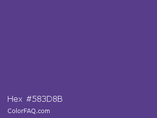 Hex #583d8b Color is a normal violet color and the nearest color is Victoria #534491. Hex code #583d8b and RGB value is rgb(88,61,139). In RGB color space, this color is composed of 35% red, 24% green, 55% blue, In CMYK color space, this color is composed of 37% cyan, 56% magenta, 0% yellow , 45% black , In HSL color space, this color has a hue angle of 261° , 39% saturation and 39% lightness.